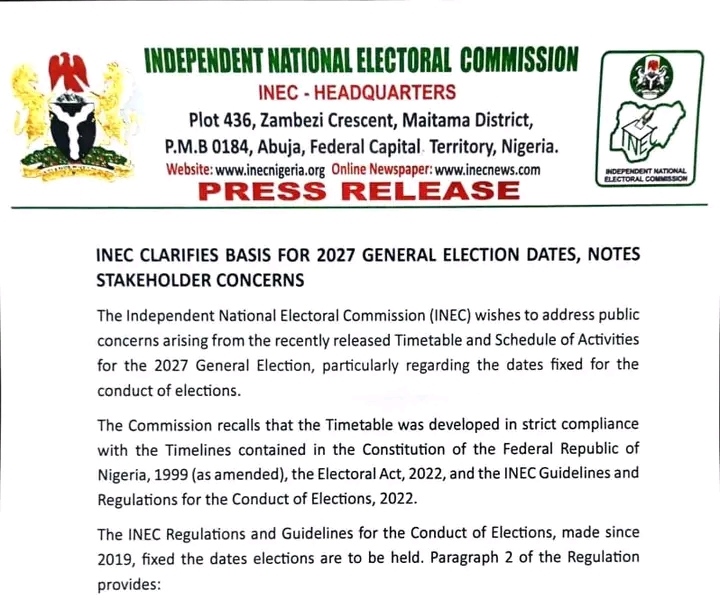 The statement reads in full, “The Independent National Electoral Commission (INEC) wishes to address public concerns arising from the recently released Timetable and Schedule of Activities for the 2027 General Election, particularly regarding the dates fixed for the conduct of elections.